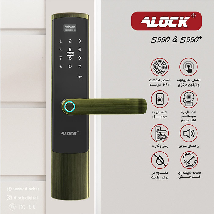 قفل دیجیتال S550 بر اساس تجربه موفق قفل هوشمند اثرانگشتی N120 و مطابق با آناتومی بدن و دست طراحی و تولید شده است. این طراحی خاص سبب محبوبیت این مدل از محصول در مقایسه با قفل های دیجیتالی شده است که از نوع اسکنرهای لوکالیزه استفاده می کنند. نیاز کشور و پروژه های مسکونی و اداری به امنیت با تکنولوژی های به روز سبب طراحی های خاص در صنعت قفل های الکترونیکی ALOCK شده است. یکی از ویژگی های دستگیره اثرانگشتی S550 طراحی زیبا و ظریف با نوع اسکنر بیومتریک ارگونومیک می باشد. صفحه لمسی و نمایشگر این دستگیره به شیشه Tempered Glass مجهز شده که این محصول را در برابر ضربه و خش پذیری بسیار مقاوم می نماید.